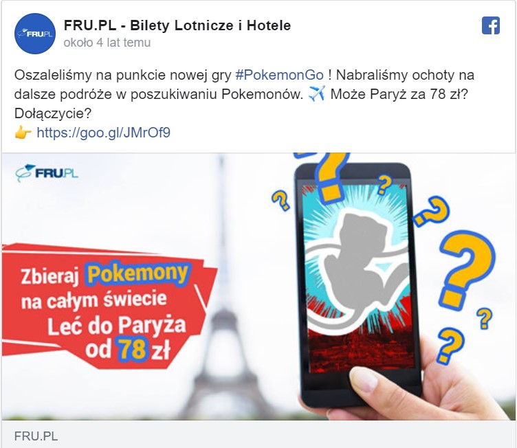 Serwis oferujący bilety lotnicze wyczuł, że gra w Pokemon Go będzie prawdziwym hitem, dlatego opublikował wpis, w którym proponuje, aby polecieć do Paryża i tam poszukać Pokemonów. Post został opatrzony hasłem “Zbieraj Pokemony na całym świecie. Leć do Paryża za 78 zł”