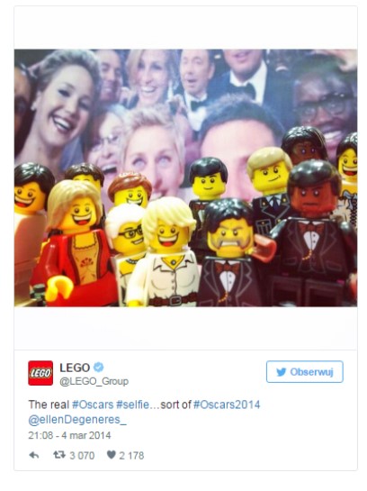 Innym przykładem może posłużyć selfie z rozdania Oscarów, które widział niemal każdy. Zostało wykorzystane między innymi przed Lego, które stworzyło własną kampanię.