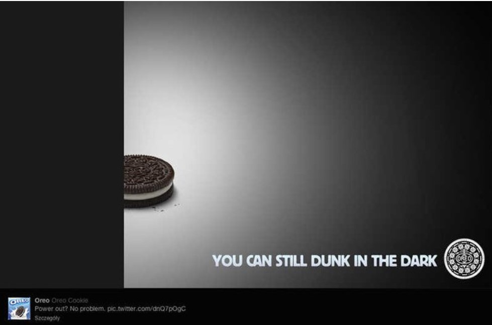 Niezwykłym refleksem popisali się marketingowcy producenta ciasteczek Oreo. W 2013 rok podczas meczu Super Bowl wykorzystali awarie prądu. W ciągu kilku minut wyprodukowali obrazek, który podbił Twittera. “Nie ma prądu? To nie problem. W ciemności także możesz maczać”. Odnosząc się do hasła firmy, która namawia do maczania ciasteczek w mleku. Wpis na oficjalnym profilu Oreo na Twitterze udostępniono w ciągu godziny ponad 10 tysięcy razy, po kilkunastu godzinach liczba dobijała do 15 tysięcy.